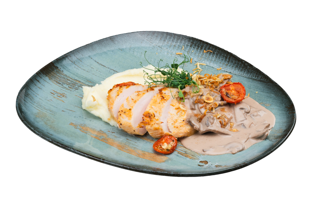 Куриная грудка с картофельным пюре и грибным соусом 200/100/100 g 225 lei