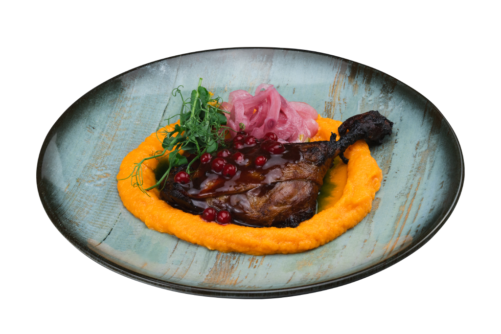 Утиная ножка “Конфи” с пюре из батата, соусом демиглас и маринованным луком 340 g 450 lei