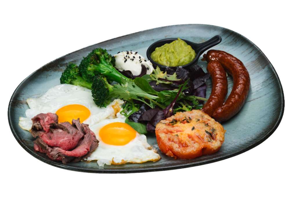 Завтрак RiverSide — охотничьи колбаски, индейка сувид, глазунья, гуакамоле, вяленые черри, круассан 470 g 155 lei